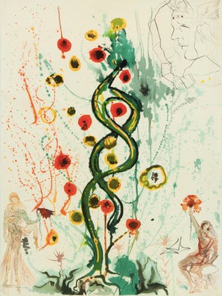 Finally, let’s tie it all together with a painting by Salvador Dalí which combines the Tree of Life (another famous symbol), the caduceus, the appearance of the double-helix, and alchemy symbolism: