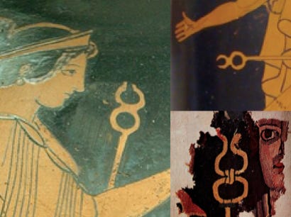 The “minimalistic” version seen in some Greek art shown below is related to the astrological symbol for Mercury, from the Hermes/Mercury connection. The horizontal line was believed to be added to make it more “Christian”.