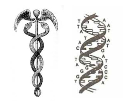The Caduceus symbol has sparked many imaginations. Many have pointed out the bizarre resemblance to DNA. Compare the shape of the Caduceus with the double helix of the DNA structure: