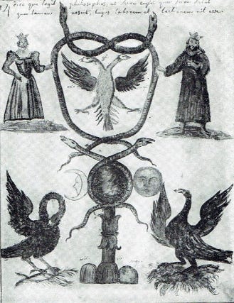 Thus, in alchemy you find the caduceus symbolizing the union of opposites with the dual, opposing snakes interlocking, next to other symbols of opposites such as sun and moon, king and queen, as shown below in an 18th-century manuscript: